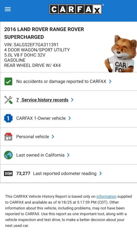 2016 Land Rover, Range Rover 75059 miles $22,500.00 Apply for credit Get Pre-Qualified See Free Carfax Report Vehicle Summary Body SUV Exterior Color Black Interior Color Beige Transmission Automatic 8-Spd Trim Supercharged Sport Utility 4D VIN SALGS2EF7GA311391 Vehicle History